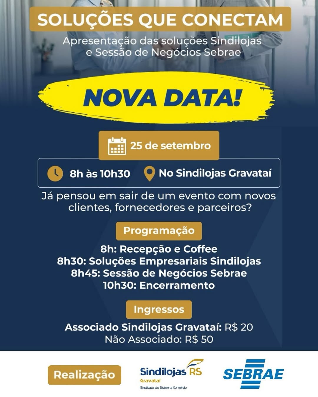 O Sindilojas Gravataí informa que o evento Soluções que Conectam: Sessão de Negócios Sindilojas & Sebrae foi transferido para o dia 25 de setembro de 2025.