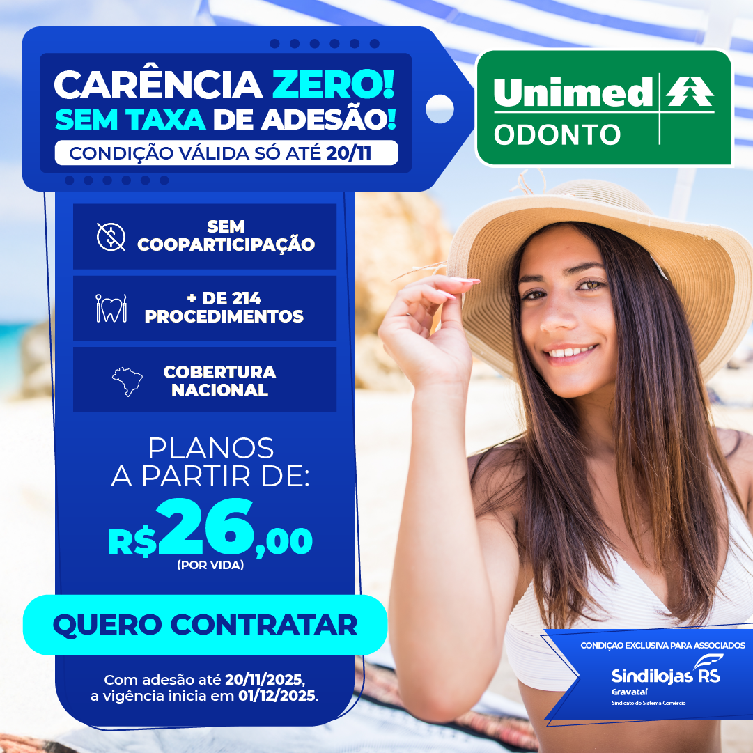 O Sindilojas Gravataí, em parceria com a Unimed, lançou a Campanha Unimed Odonto de Verão 2025/26, oferecendo condições imperdíveis para quem quer cuidar do sorriso e da saúde bucal com economia e praticidade, para não ter vergonha de sorrir no verão e nas férias!