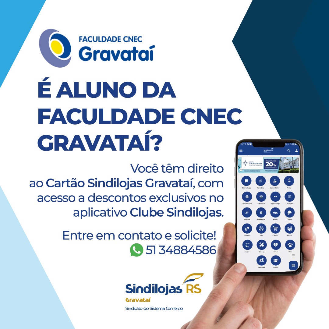 Os estudantes da Faculdade CNEC Gravataí contam com um benefício especial: o cartão Sindilojas Gravataí, que oferece descontos exclusivos em diversas lojas e estabelecimentos associados da cidade e região.