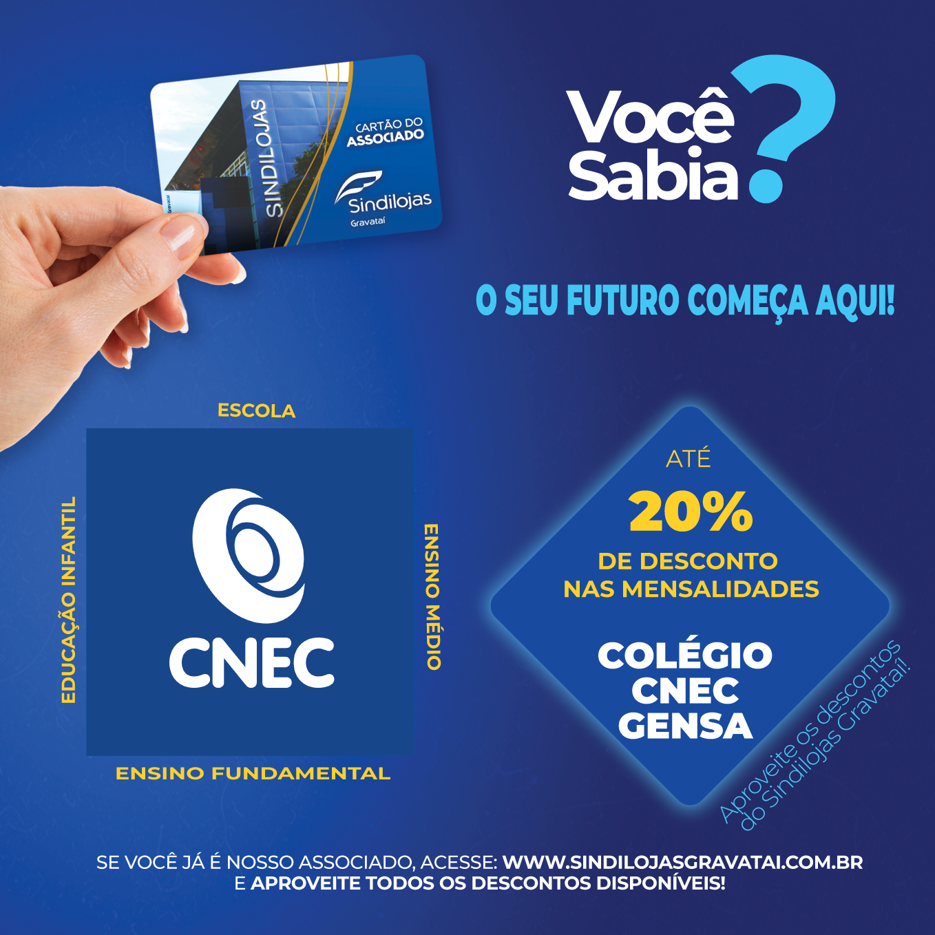 A parceria entre o Sindilojas Gravataí e o Colégio Gensa está trazendo benefícios aos associados, com desconto de 20% nas mensalidades. O convênio tem por objetivo oferecer e facilitar o acesso à educação, promovendo a qualidade de ensino aos associados e usuários do cartão do Sindilojas.