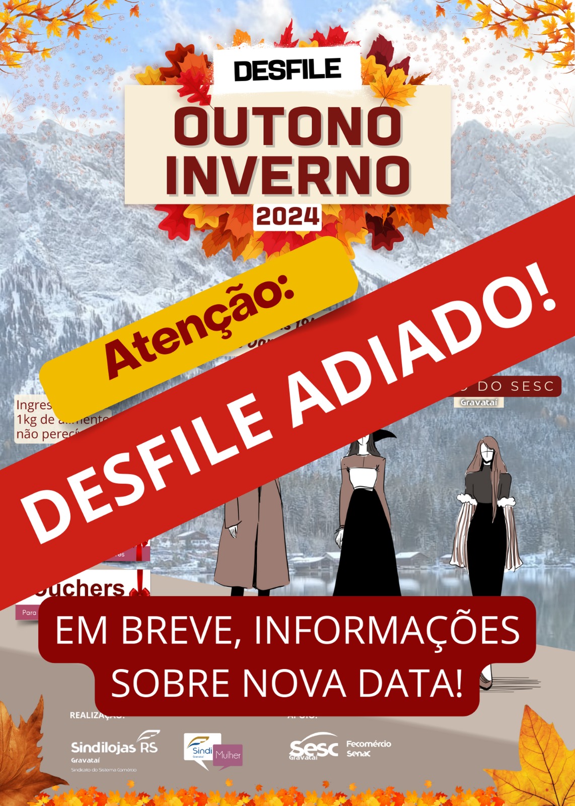Em virtude das condições climáticas adversas e a previsão da ocorrência de intensas chuvas nas próximas horas, o Sindilojas Gravataí, por meio da Comissão Sindimulher, decidiu adiar o Desfile Outono Inverno 2024, agendado para ser realizado na noite desta terça-feira (30/04), no Auditório do Sesc Gravataí.