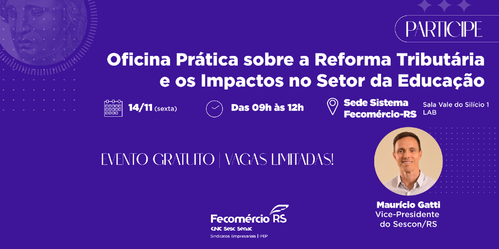 Dando continuidade às oficinas gratuitas sobre os impactos da Reforma Tributária, a Fecomércio-RS promove mais uma edição, no dia 14 de novembro, das 9h às 12h. Voltado ao setor da educação, o encontro será realizado na sede da Federação e coordenado pelo contador, vice-presidente do Sescon/RS, proprietário da Gatti Contabilidade e vice-presidente do Grupo Brasil de Empresas Contábeis (GBrasil), Mauricio Gatti. As inscrições podem ser feitas neste link.