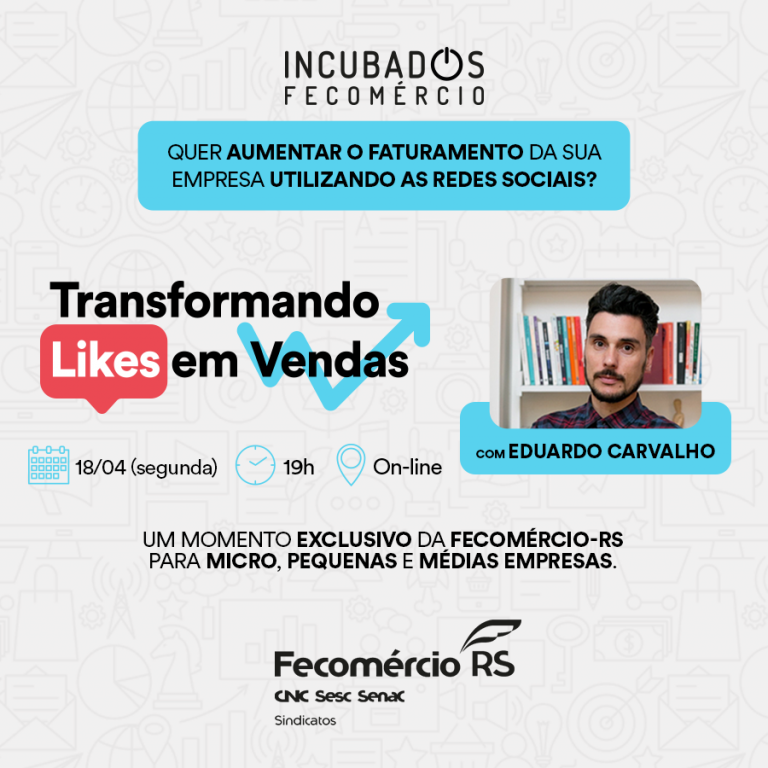 A Fecomércio-RS está lançando a segunda fase do Projeto Incubados com a palestra Transformando Like em Vendas. O momento de lançamento foi transferido e agora acontecerá no dia 18 de abril, às 19h, no YouTube da Federação, com a palestra de Eduardo Carvalho, publicitário com especialização em Marketing e Vendas e mais de 19 anos de experiência no mercado da propaganda.