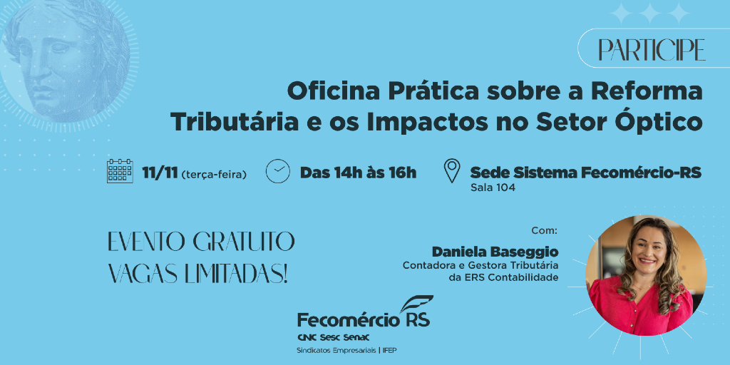 No próximo dia 11 de novembro, a Fecomércio-RS promoverá uma oficina prática sobre a Reforma Tributária e os impactos no setor óptico. O encontro será realizado das 14h às 16h, na sede entidade. A capacitação é gratuita e será ministrada pela contadora, pós-graduada em Direito Tributário e Gestora Tributária da ERS Contabilidade, Daniela Baseggio. As inscrições podem ser feitas neste link.