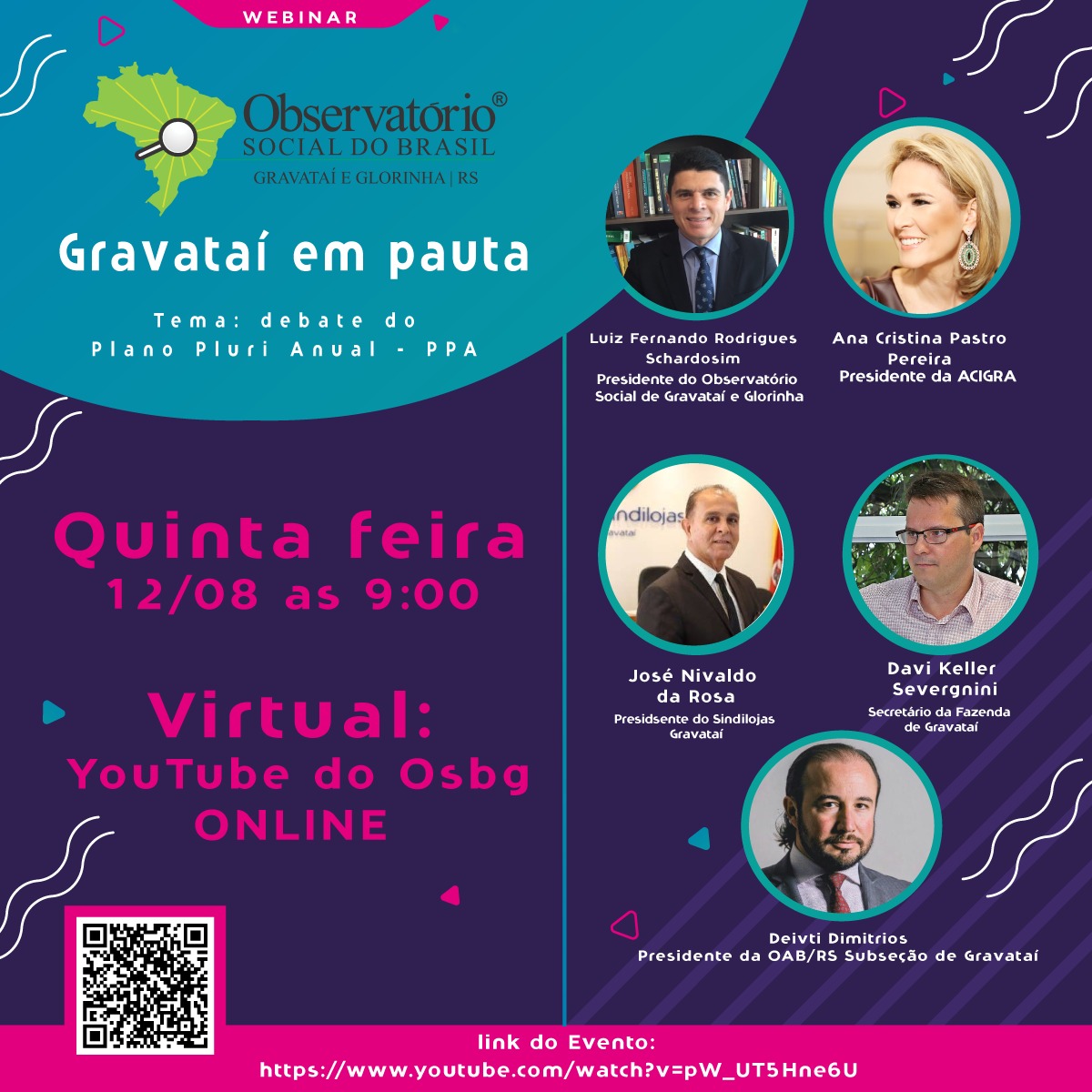 O presidente do Sindilojas Gravataí, José Rosa, participará do Debate Virtual sobre o Plano Plurianual – PPA da Gestão Administrativa do município, nesta quinta-feira (12), às 09h, via canal do You tube do Observatório Social do Brasil de Gravataí e Glorinha (OSBG).