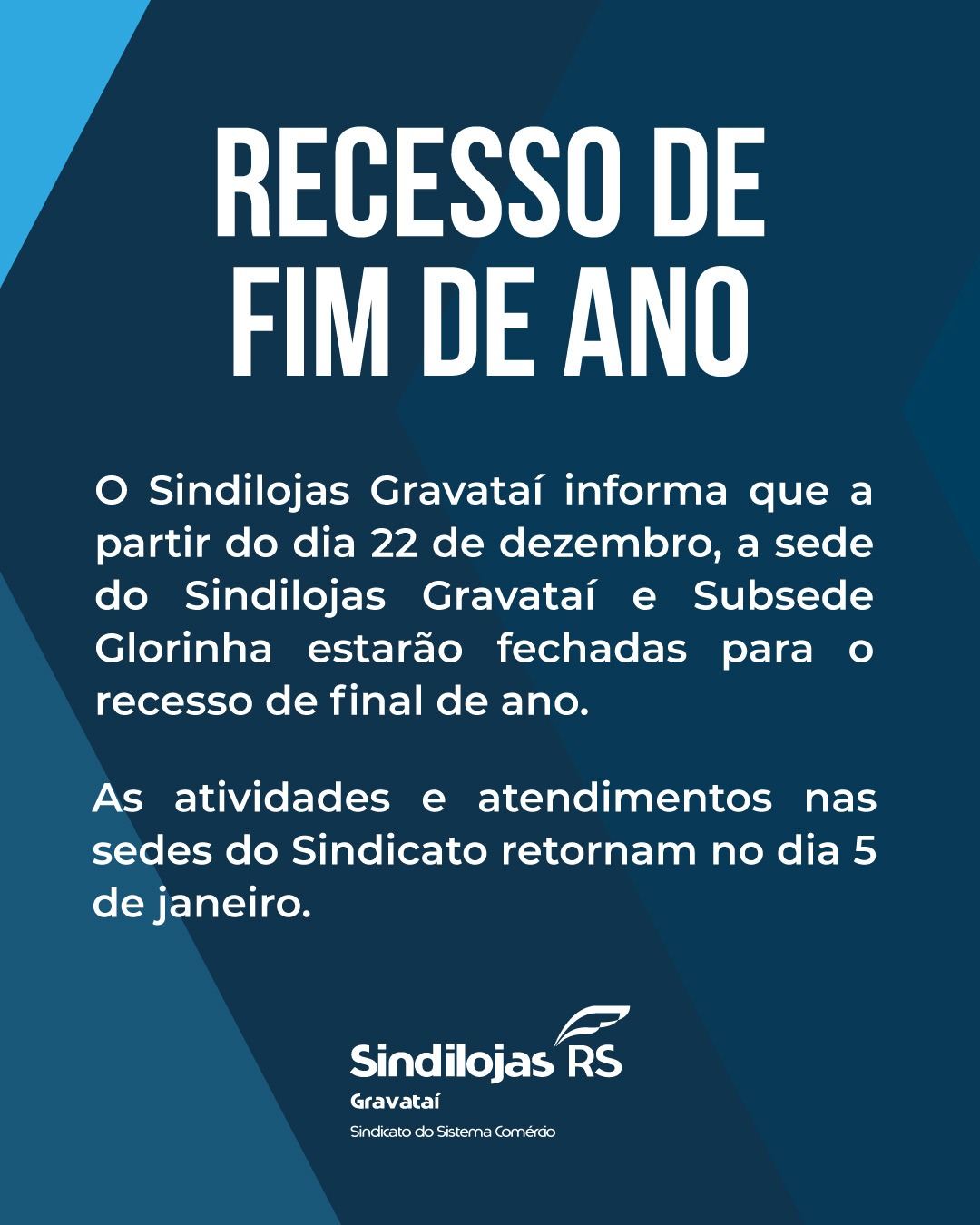O Sindilojas Gravataí informa que a partir do dia 22 de dezembro, a sede do Sindilojas Gravataí e Subsede Glorinha estarão fechadas para o recesso de final de ano.