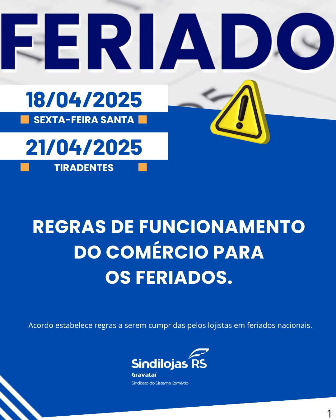 Atenção, lojistas de Gravataí! De acordo com a Convenção Coletiva de Trabalho de 1º de março de 2024 entre Sindilojas Gravataí e Sindicato dos Empregados no Comércio de Canoas (Sindec), ficam estabelecidas as seguintes diretrizes para a abertura do comércio nos feriados de 18 de abril (Sexta-Feira Santa) e 21 de abril de 2025 (Tiradentes):
