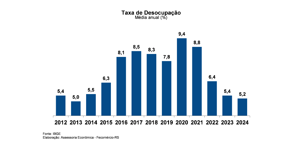 A média anual da taxa de desocupação do RS em 2024 foi de 5,2% (menor que os 5,4% de 2023), enquanto a informalidade permaneceu em 31,9%, a quinta menor do Brasil. O número é o menor desde 2014, onde a taxa de desocupação foi de 5,5%, número que chegou a bater os 9,4% em 2020 como taxa mais alta no período.