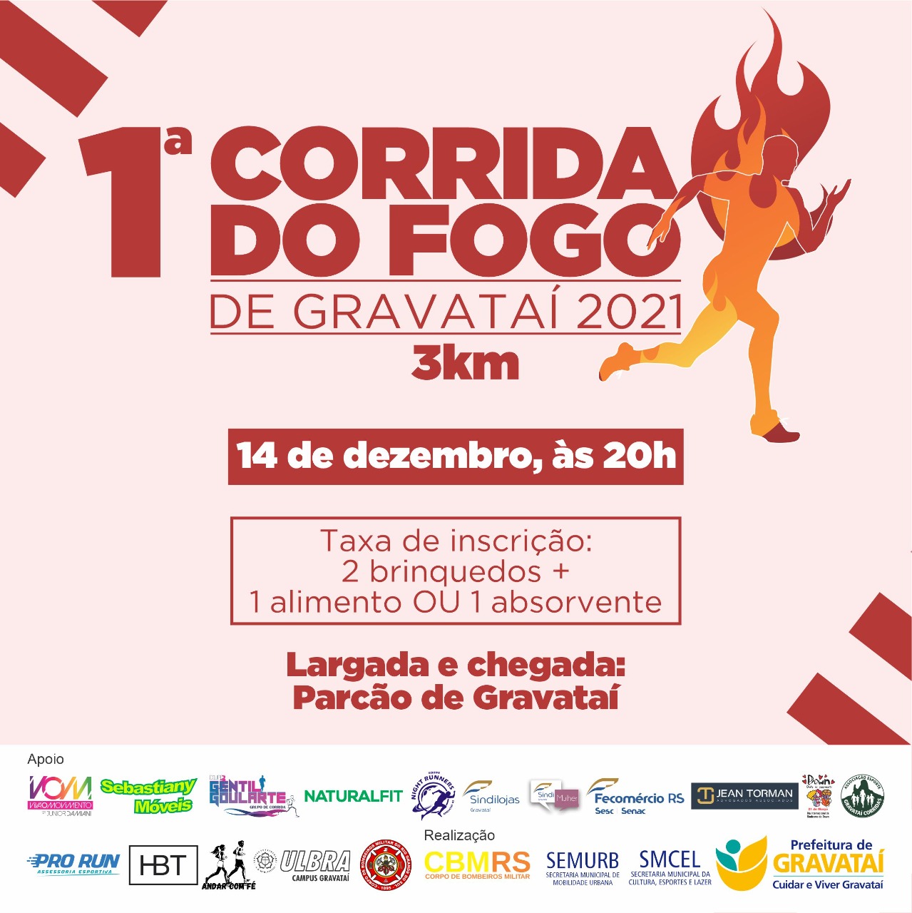 O Corpo de Bombeiros Militar do Estado do Rio Grande do Sul- 1º Pelotão de Gravataí promove, no dia 14 de dezembro, às 20h, a 1ª Corrida do Fogo de Gravataí 2021, que conta com um trajeto de 3 Km de corrida, sendo saída e chegada no Parcão de Gravataí. O evento conta com a parceria de diversas entidades do município e tem por objetivo promover e incentivar o esporte, a saúde e a solidariedade, além da arrecadação de doações, como brinquedos, alimentos e absorventes femininos, para serem distribuídos para as pessoas que estão em situação de dificuldade e vulnerabilidade social.