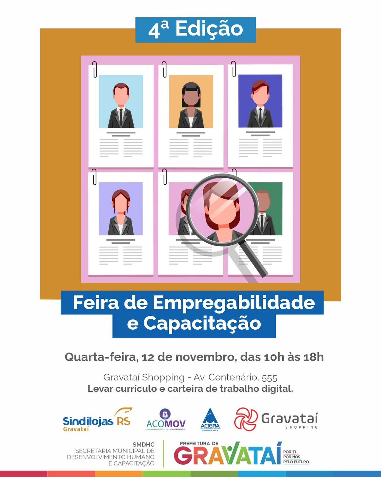 O Sindilojas Gravataí participará da 4ª edição da Feira da Empregabilidade, promovida pela Prefeitura de Gravataí, que acontecerá no dia 12 de novembro, das 10h às 18h, no Gravataí Shopping Center.
