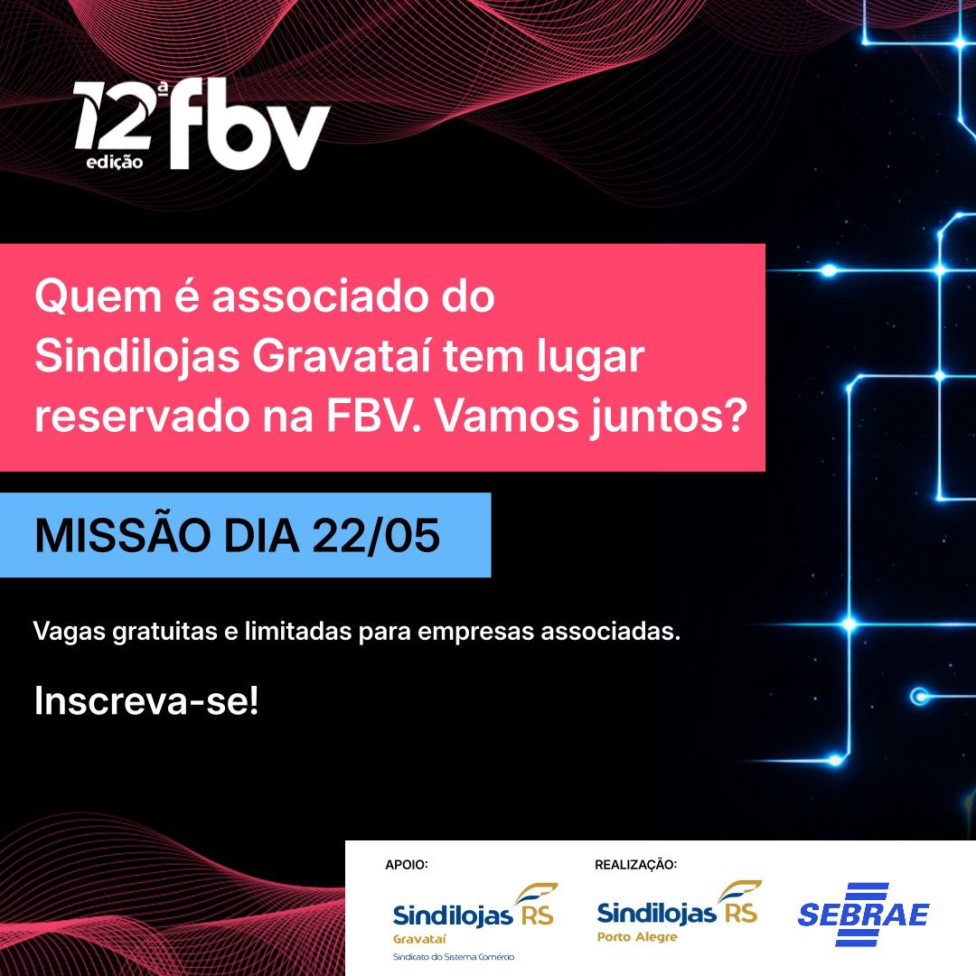 O Sindilojas Gravataí está organizando uma caravana para a Feira Brasileira do Varejo (FBV) 2026, um dos principais eventos do setor varejista, que neste ano traz como tema “O futuro do varejo é agora”.