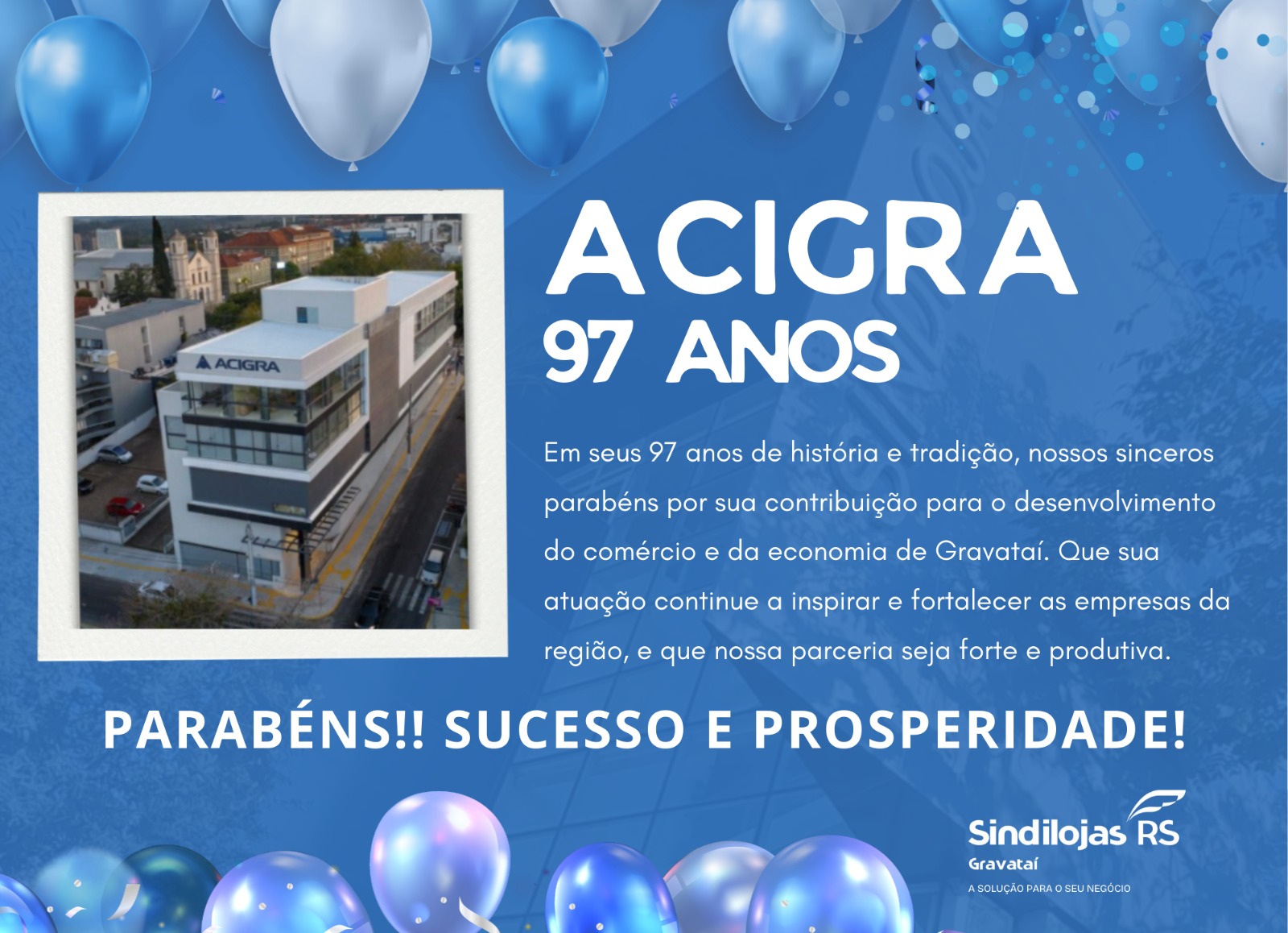 O Sindilojas Gravataí parabeniza a Associação Comercial, Industrial e de Serviços de Gravataí (ACIGRA) pelos seus 97 anos de fundação, celebrados no último dia 28 de agosto, em um almoço comemorativo que reuniu autoridades, empresários e lideranças locais.