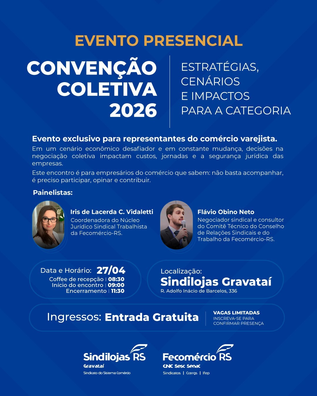 O encontro contará com a participação de especialistas da área, como Iris de Lacerda Cassana Vidaletti, coordenadora do Núcleo Jurídico Sindical Trabalhista da Fecomércio-RS, e Flávio Obino Neto, advogado trabalhista empresarial e consultor em relações sindicais.