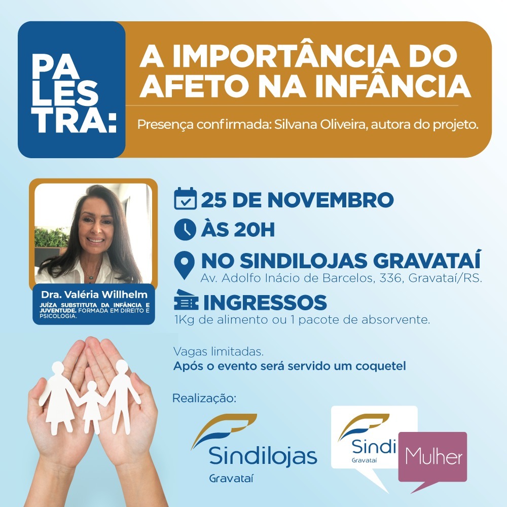 O Sindilojas Gravataí, por meio do Sindimulher, realiza palestra sobre A importância do Afeto na Infância, no dia 25 de novembro, quinta-feira, às 20h, na sede da entidade. A palestra será ministrada pela psicóloga e advogada, Juíza Substituta da Infância e Juventude, Dra. Valéria Willhelm.