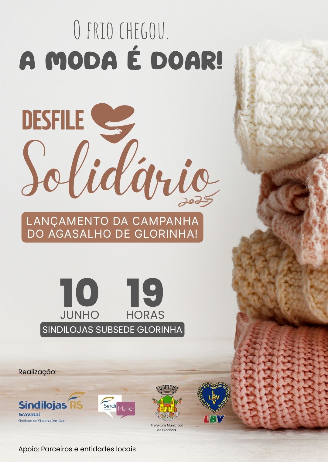 O Sindilojas Gravataí, por meio da Subsede de Glorinha, realiza no dia 10 de junho, às 19 horas, a 3ª edição do Desfile Solidário, evento que marca o lançamento oficial da Campanha do Agasalho 2025.