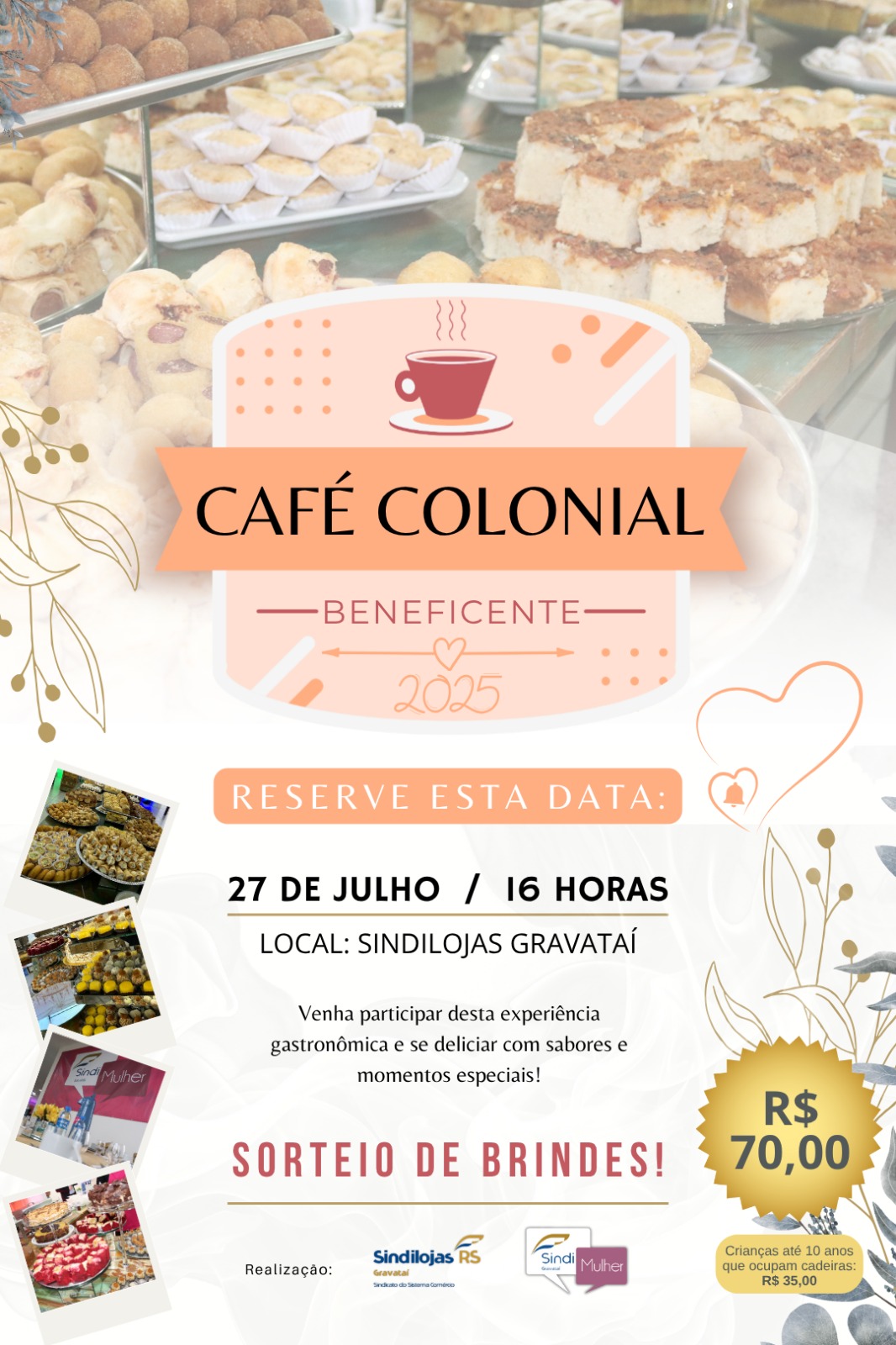 O Sindilojas Gravataí, por meio da Comissão SindiMulher, convida você para mais uma edição do tradicional Café Colonial Beneficente, um evento pensado com carinho para proporcionar uma tarde acolhedora, repleta de sabores irresistíveis e bons momentos.