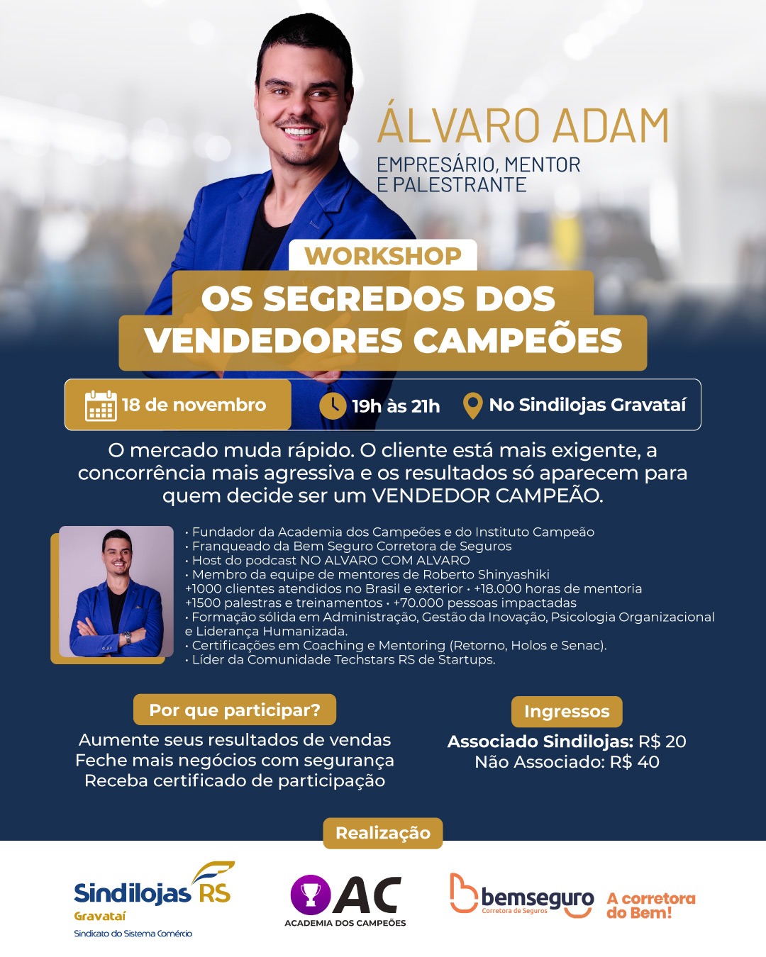 O Sindilojas Gravataí promove, no dia 18 de novembro (terça-feira), às 19h, o workshop “Os Segredos dos Vendedores Campeões”, uma experiência prática e transformadora voltada a todos que desejam alavancar seus resultados em vendas e conquistar a alta performance profissional.